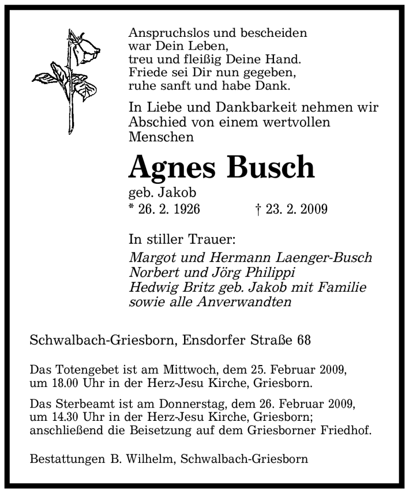 Hier finden Sie alle Traueranzeigen aus der Zeitung, die bisher für Agnes Busch erschienen sind. Weitere Traueranzeigen, die in der Zeitung erscheinen, werden hier ebenfalls aufgelistet