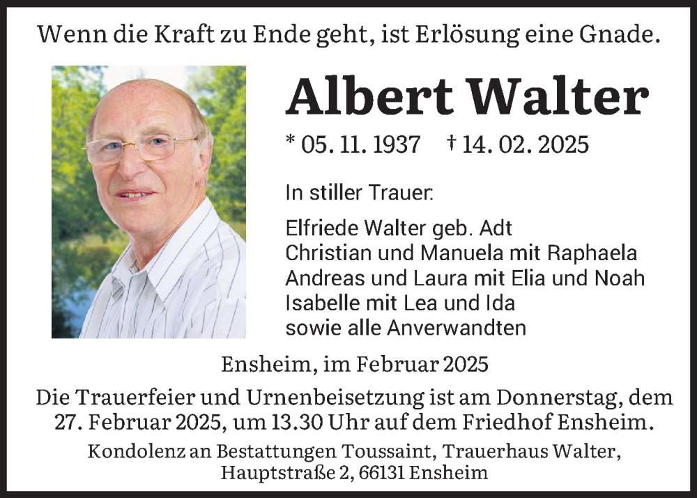 Hier finden Sie alle Traueranzeigen aus der Zeitung, die bisher für Albert Walter erschienen sind. Weitere Traueranzeigen, die in der Zeitung erscheinen, werden hier ebenfalls aufgelistet
