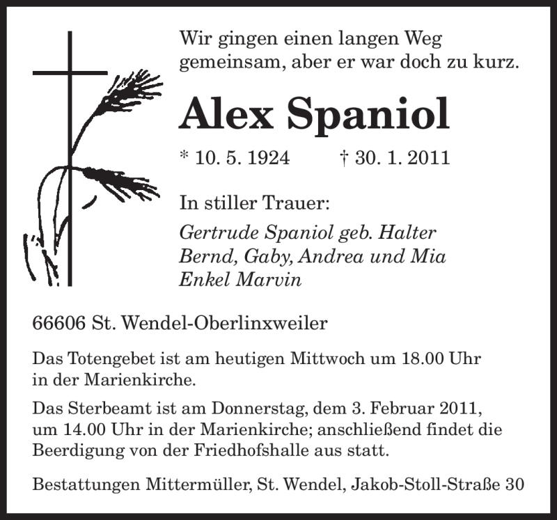 Hier finden Sie alle Traueranzeigen aus der Zeitung, die bisher für Alex Spaniol erschienen sind. Weitere Traueranzeigen, die in der Zeitung erscheinen, werden hier ebenfalls aufgelistet