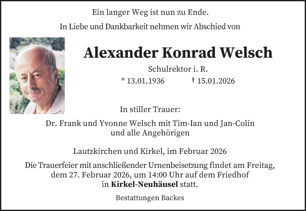 Hier finden Sie alle Traueranzeigen aus der Zeitung, die bisher für Alexander Konrad Welsch erschienen sind. Weitere Traueranzeigen, die in der Zeitung erscheinen, werden hier ebenfalls aufgelistet