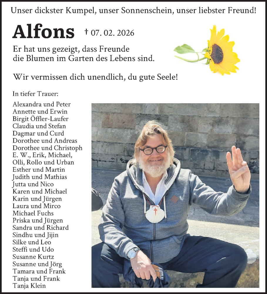 Hier finden Sie alle Traueranzeigen aus der Zeitung, die bisher für Alfons erschienen sind. Weitere Traueranzeigen, die in der Zeitung erscheinen, werden hier ebenfalls aufgelistet