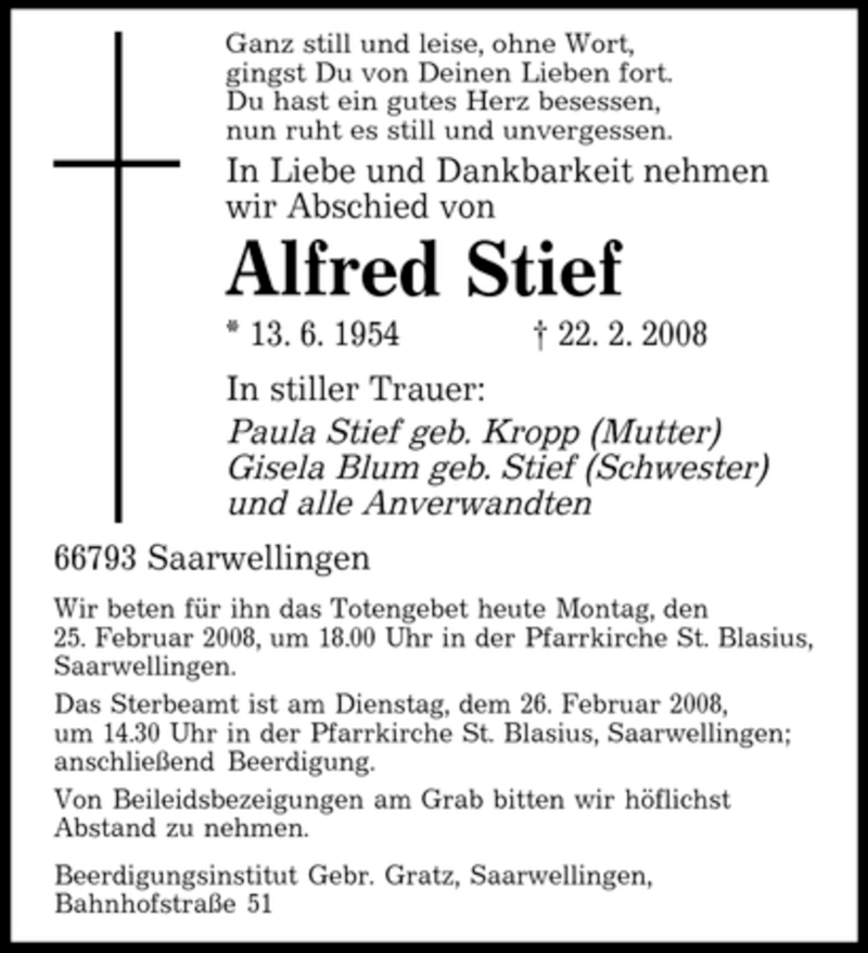 Hier finden Sie alle Traueranzeigen aus der Zeitung, die bisher für Alfred Stief erschienen sind. Weitere Traueranzeigen, die in der Zeitung erscheinen, werden hier ebenfalls aufgelistet