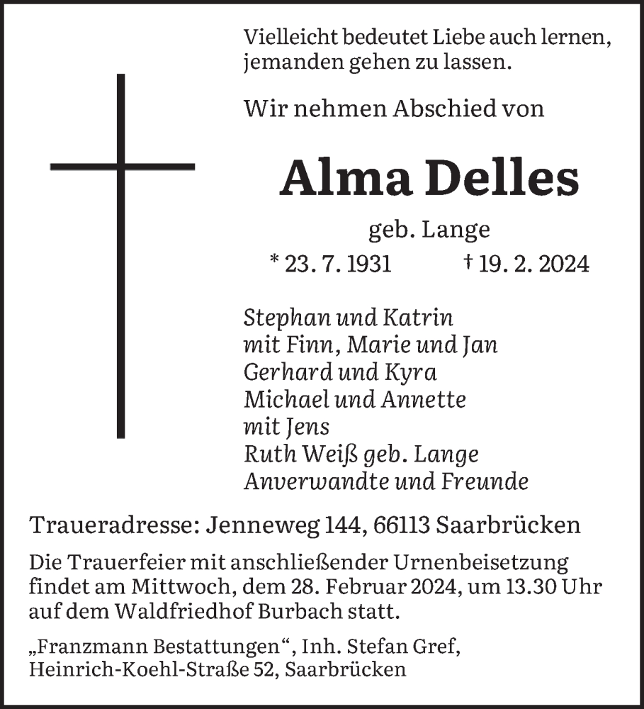 Hier finden Sie alle Traueranzeigen aus der Zeitung, die bisher für Alma Delles erschienen sind. Weitere Traueranzeigen, die in der Zeitung erscheinen, werden hier ebenfalls aufgelistet