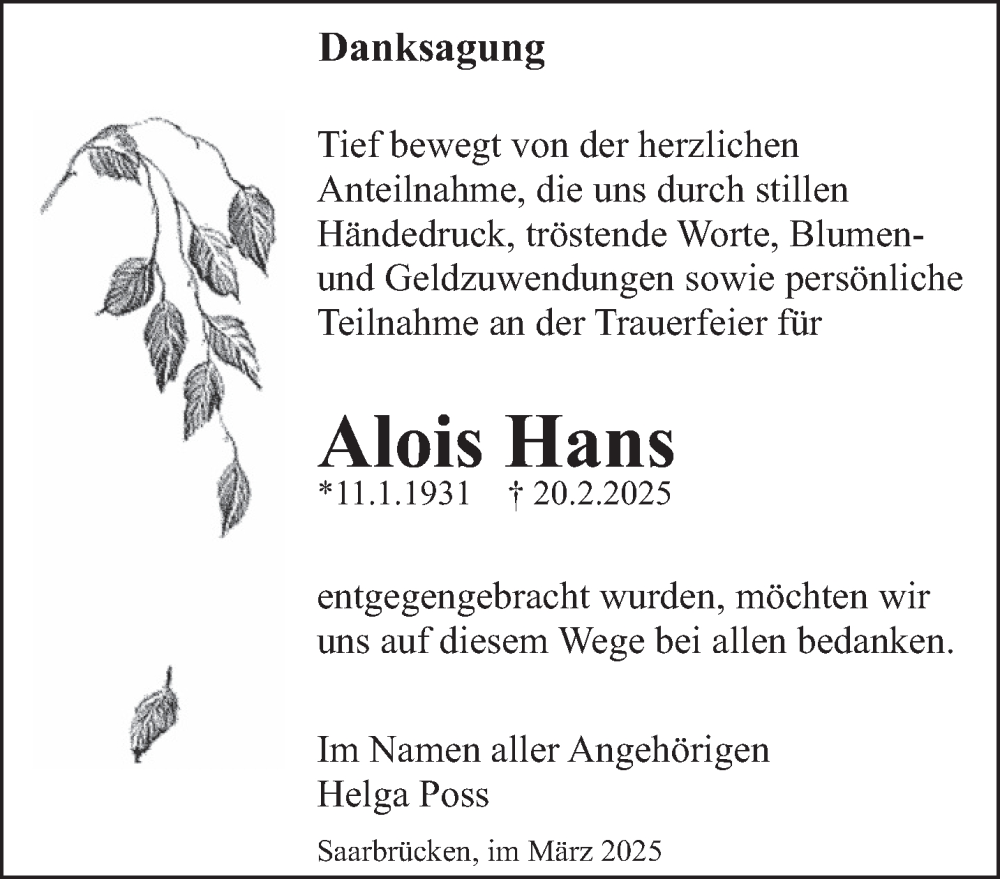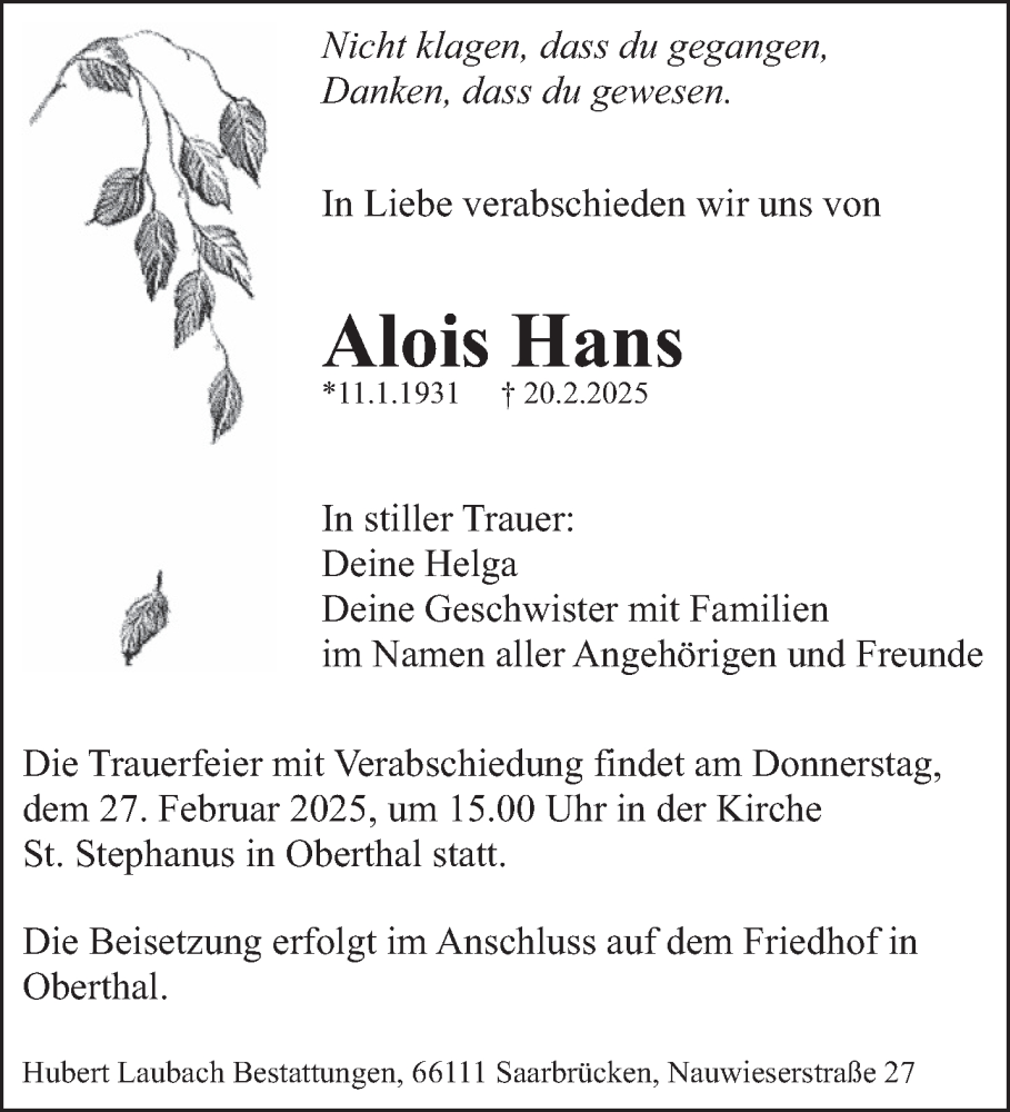 Hier finden Sie alle Traueranzeigen aus der Zeitung, die bisher für Alois Hans erschienen sind. Weitere Traueranzeigen, die in der Zeitung erscheinen, werden hier ebenfalls aufgelistet