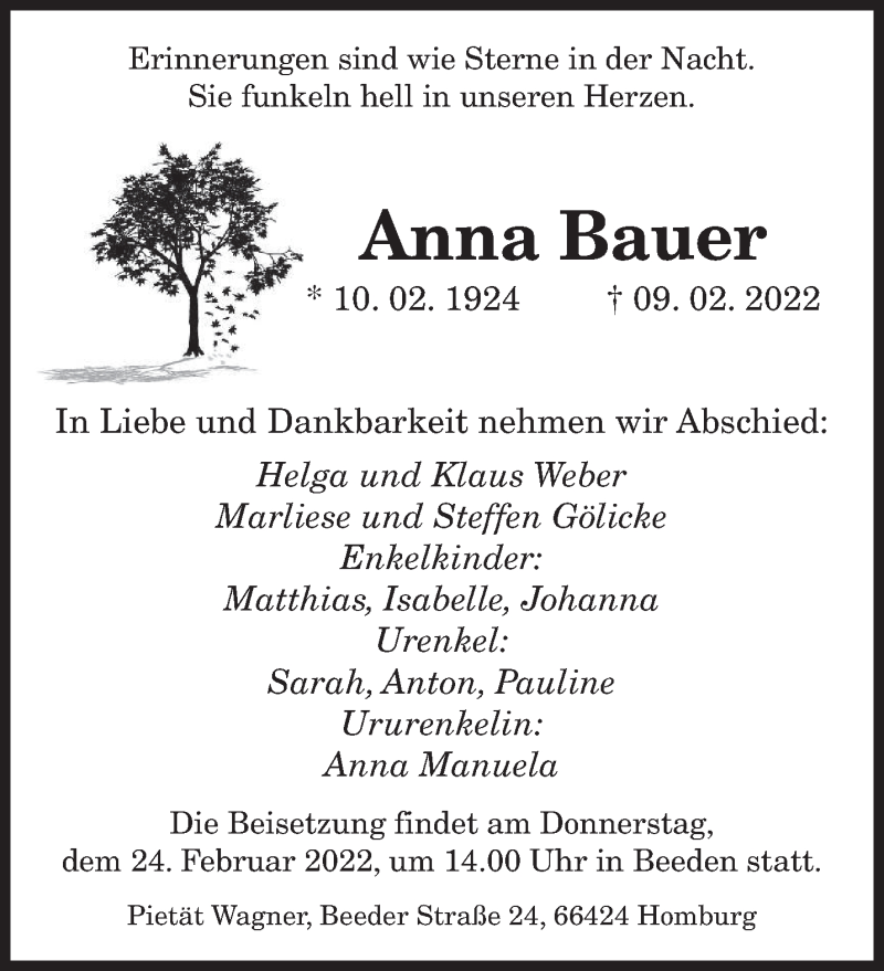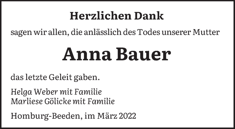 Hier finden Sie alle Traueranzeigen aus der Zeitung, die bisher für Anna Bauer erschienen sind. Weitere Traueranzeigen, die in der Zeitung erscheinen, werden hier ebenfalls aufgelistet