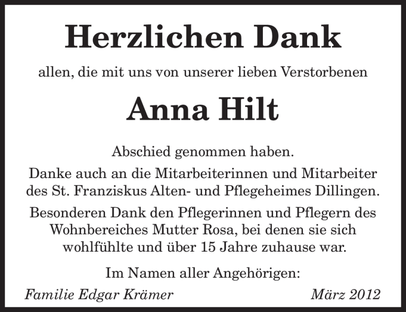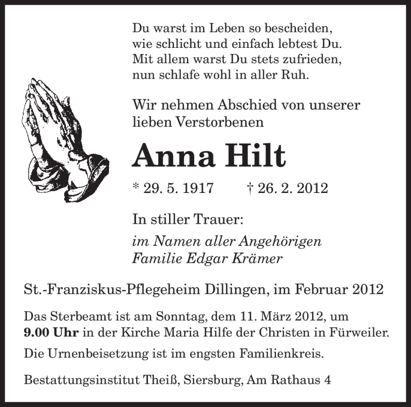 Hier finden Sie alle Traueranzeigen aus der Zeitung, die bisher für Anna Hilt erschienen sind. Weitere Traueranzeigen, die in der Zeitung erscheinen, werden hier ebenfalls aufgelistet