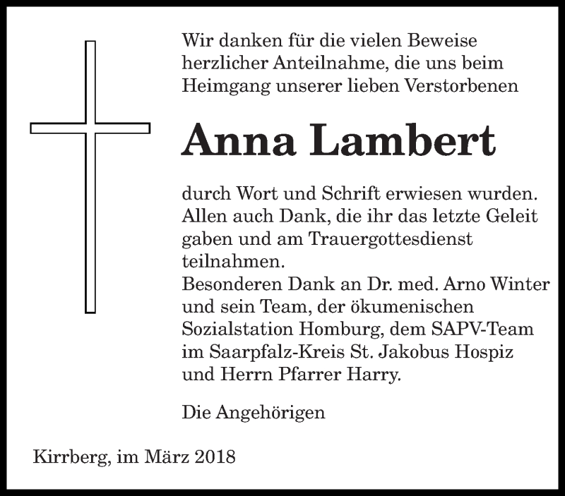 Hier finden Sie alle Traueranzeigen aus der Zeitung, die bisher für Anna Lambert erschienen sind. Weitere Traueranzeigen, die in der Zeitung erscheinen, werden hier ebenfalls aufgelistet
