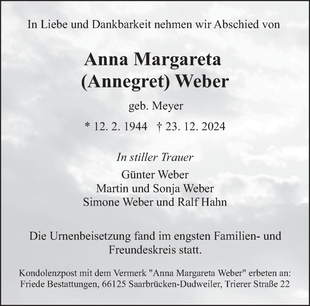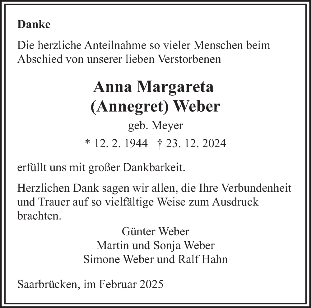 Hier finden Sie alle Traueranzeigen aus der Zeitung, die bisher für Anna Margareta Weber erschienen sind. Weitere Traueranzeigen, die in der Zeitung erscheinen, werden hier ebenfalls aufgelistet