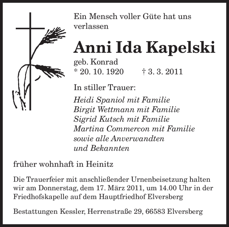 Hier finden Sie alle Traueranzeigen aus der Zeitung, die bisher für Anni Ida Kapelski erschienen sind. Weitere Traueranzeigen, die in der Zeitung erscheinen, werden hier ebenfalls aufgelistet
