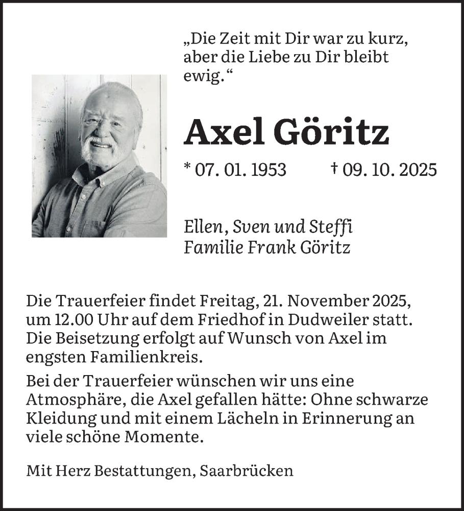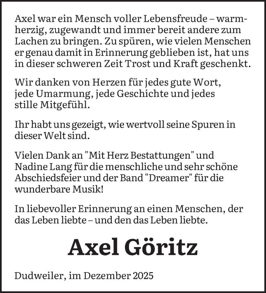 Hier finden Sie alle Traueranzeigen aus der Zeitung, die bisher für Axel Göritz erschienen sind. Weitere Traueranzeigen, die in der Zeitung erscheinen, werden hier ebenfalls aufgelistet