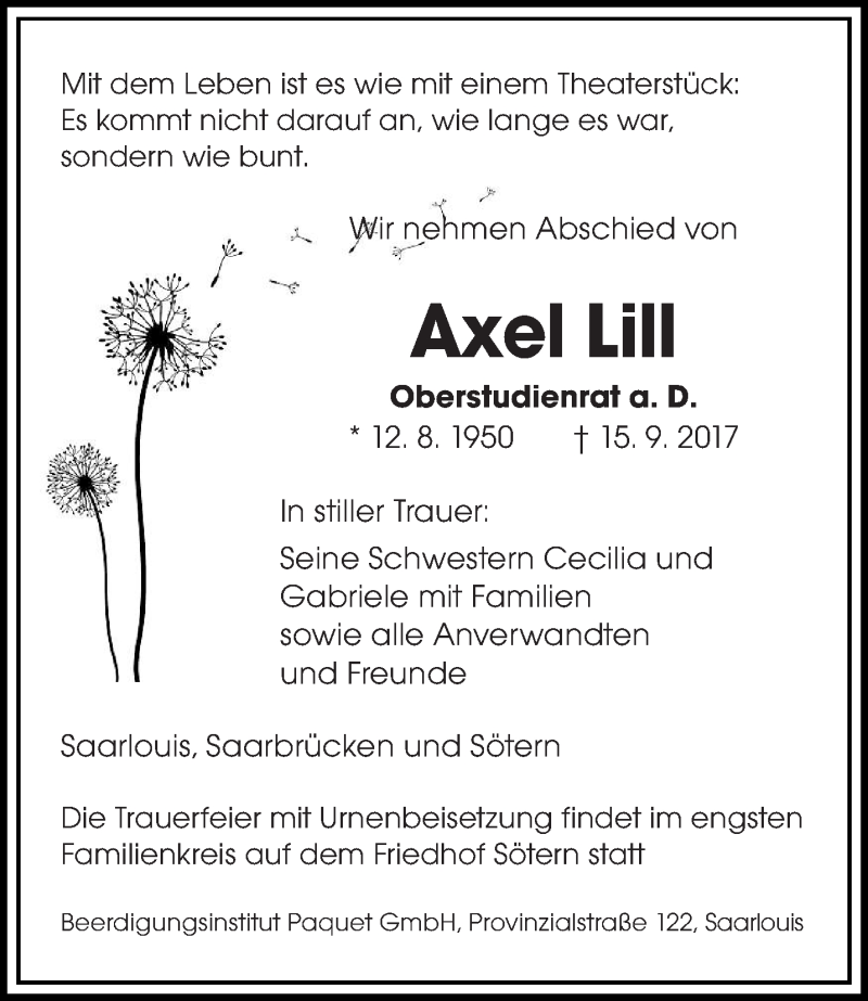 Hier finden Sie alle Traueranzeigen aus der Zeitung, die bisher für Axel Lill erschienen sind. Weitere Traueranzeigen, die in der Zeitung erscheinen, werden hier ebenfalls aufgelistet