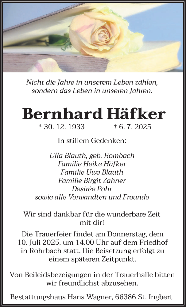 Hier finden Sie alle Traueranzeigen aus der Zeitung, die bisher für Bernhard Häfker erschienen sind. Weitere Traueranzeigen, die in der Zeitung erscheinen, werden hier ebenfalls aufgelistet