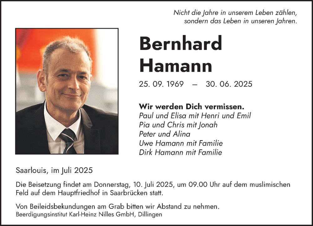 Hier finden Sie alle Traueranzeigen aus der Zeitung, die bisher für Bernhard Hamann erschienen sind. Weitere Traueranzeigen, die in der Zeitung erscheinen, werden hier ebenfalls aufgelistet