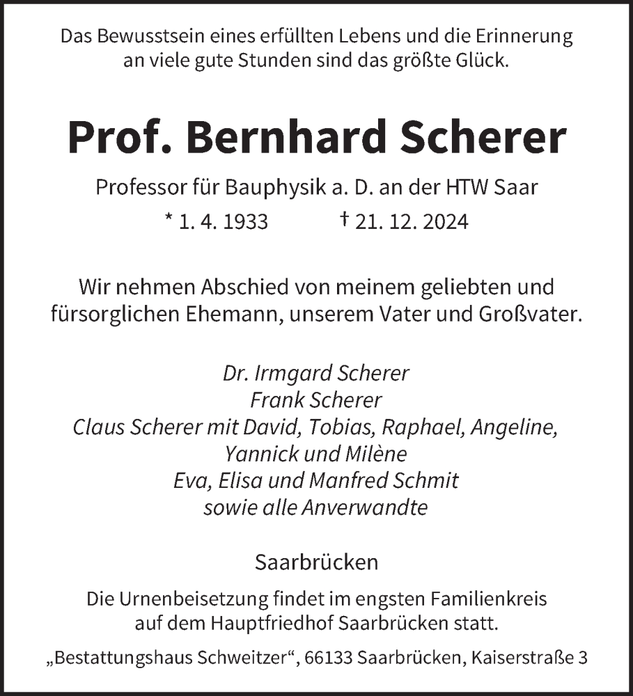 Hier finden Sie alle Traueranzeigen aus der Zeitung, die bisher für Bernhard Scherer erschienen sind. Weitere Traueranzeigen, die in der Zeitung erscheinen, werden hier ebenfalls aufgelistet