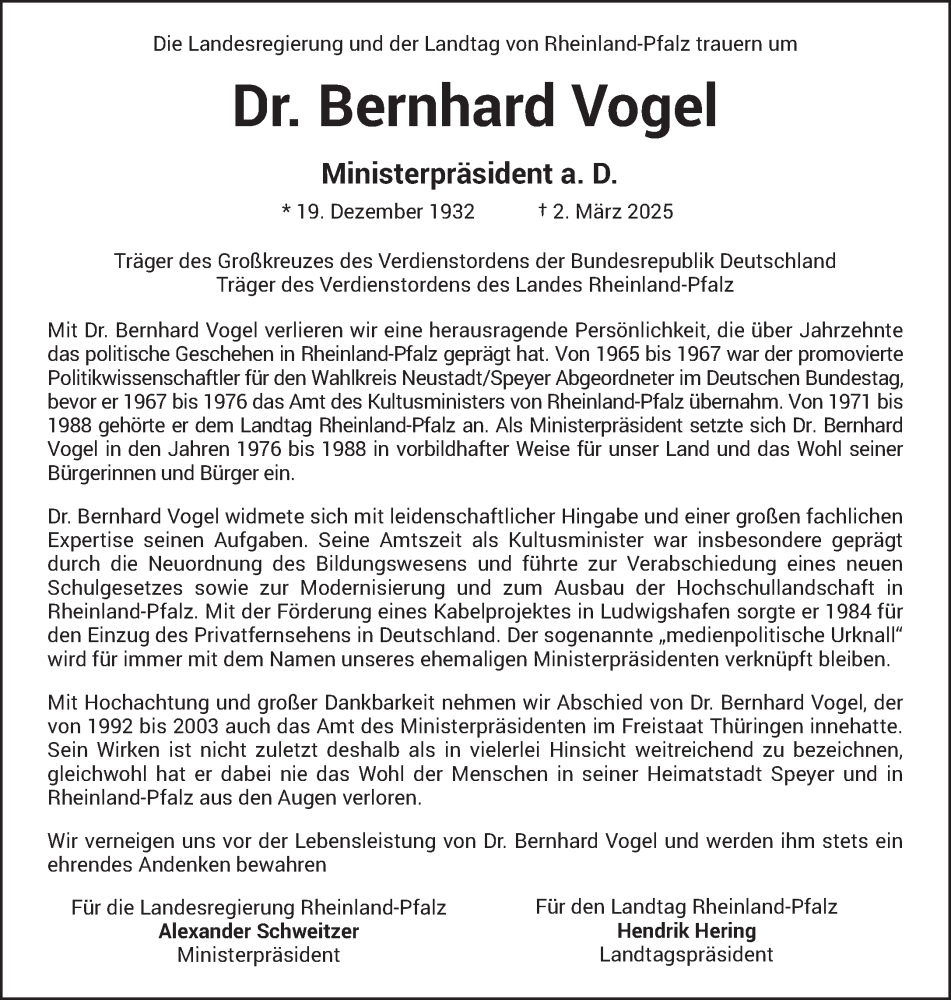 Hier finden Sie alle Traueranzeigen aus der Zeitung, die bisher für Bernhard Vogel erschienen sind. Weitere Traueranzeigen, die in der Zeitung erscheinen, werden hier ebenfalls aufgelistet