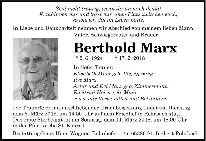 Hier finden Sie alle Traueranzeigen aus der Zeitung, die bisher für Berthold Marx erschienen sind. Weitere Traueranzeigen, die in der Zeitung erscheinen, werden hier ebenfalls aufgelistet