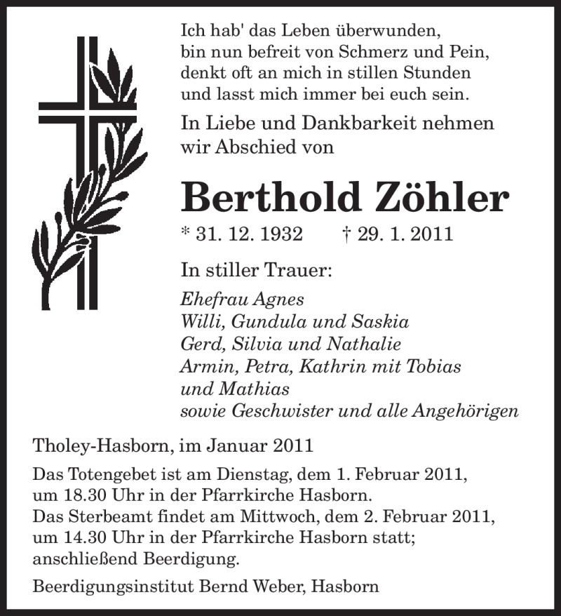 Hier finden Sie alle Traueranzeigen aus der Zeitung, die bisher für Berthold Zöhler erschienen sind. Weitere Traueranzeigen, die in der Zeitung erscheinen, werden hier ebenfalls aufgelistet