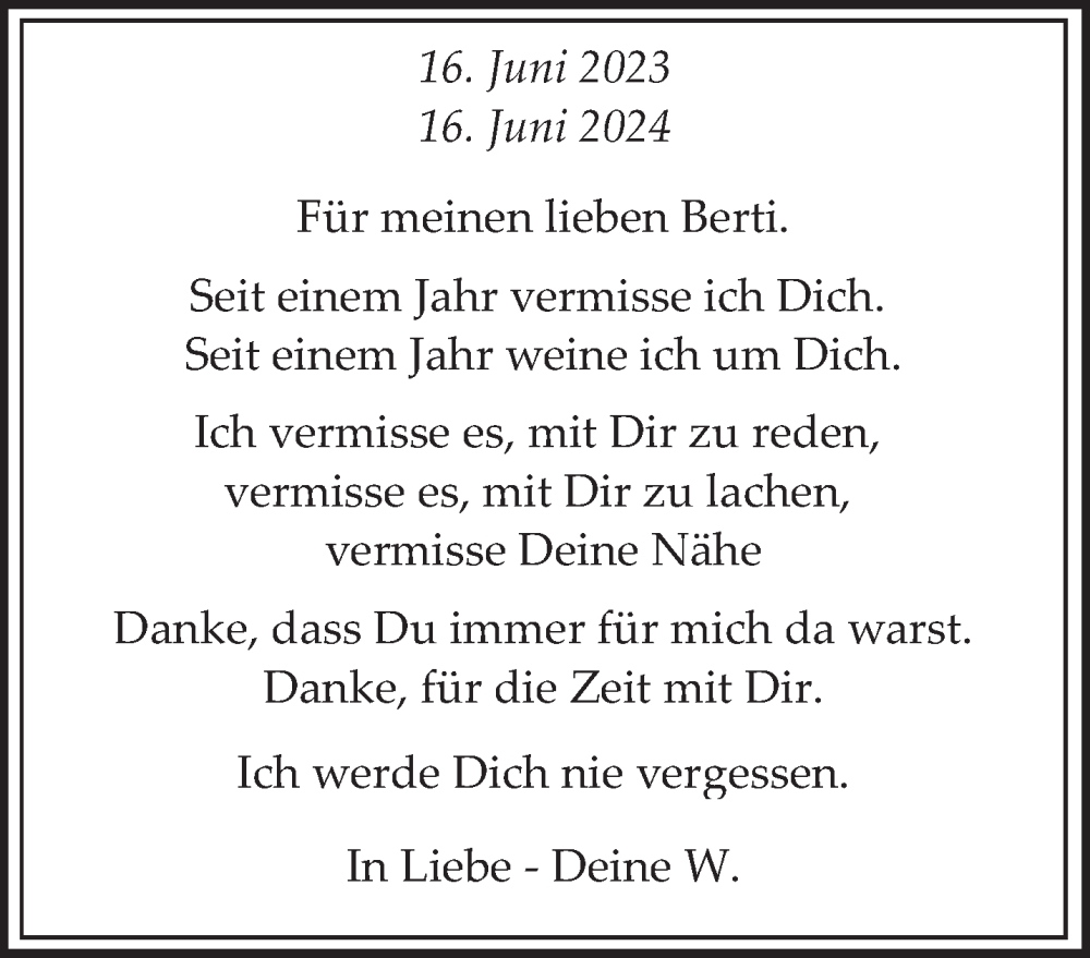Hier finden Sie alle Traueranzeigen aus der Zeitung, die bisher für Berti erschienen sind. Weitere Traueranzeigen, die in der Zeitung erscheinen, werden hier ebenfalls aufgelistet