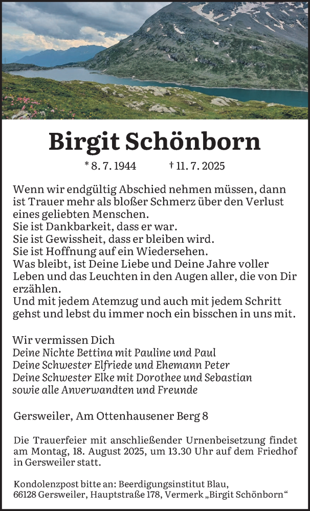 Hier finden Sie alle Traueranzeigen aus der Zeitung, die bisher für Birgit Schönborn erschienen sind. Weitere Traueranzeigen, die in der Zeitung erscheinen, werden hier ebenfalls aufgelistet