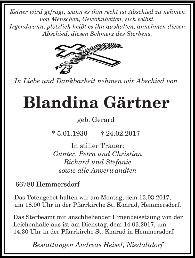 Hier finden Sie alle Traueranzeigen aus der Zeitung, die bisher für Blandina Gärtner erschienen sind. Weitere Traueranzeigen, die in der Zeitung erscheinen, werden hier ebenfalls aufgelistet