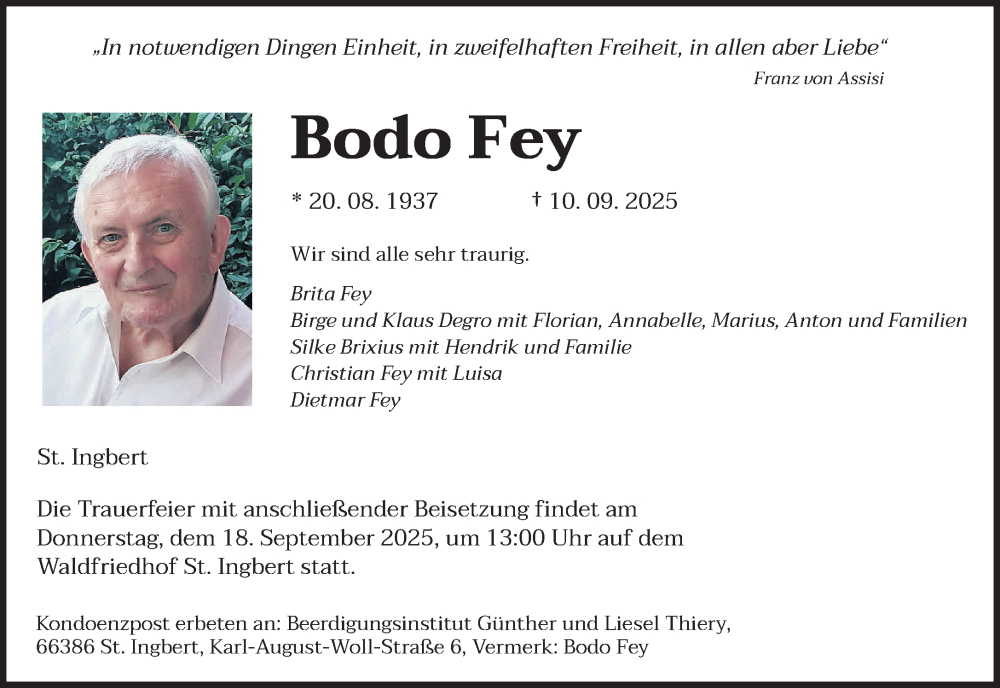 Hier finden Sie alle Traueranzeigen aus der Zeitung, die bisher für Bodo Fey erschienen sind. Weitere Traueranzeigen, die in der Zeitung erscheinen, werden hier ebenfalls aufgelistet