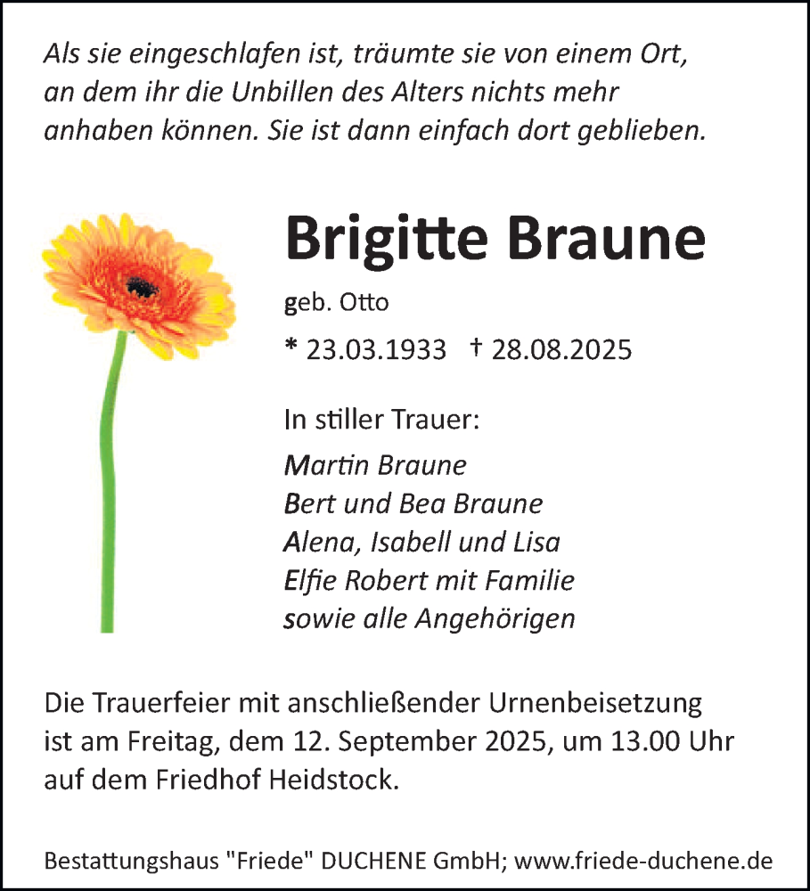 Hier finden Sie alle Traueranzeigen aus der Zeitung, die bisher für Brigitte Braune erschienen sind. Weitere Traueranzeigen, die in der Zeitung erscheinen, werden hier ebenfalls aufgelistet