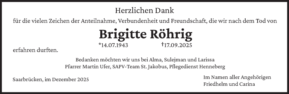 Hier finden Sie alle Traueranzeigen aus der Zeitung, die bisher für Brigitte Röhrig erschienen sind. Weitere Traueranzeigen, die in der Zeitung erscheinen, werden hier ebenfalls aufgelistet