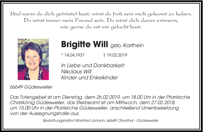 Hier finden Sie alle Traueranzeigen aus der Zeitung, die bisher für Brigitte Will erschienen sind. Weitere Traueranzeigen, die in der Zeitung erscheinen, werden hier ebenfalls aufgelistet
