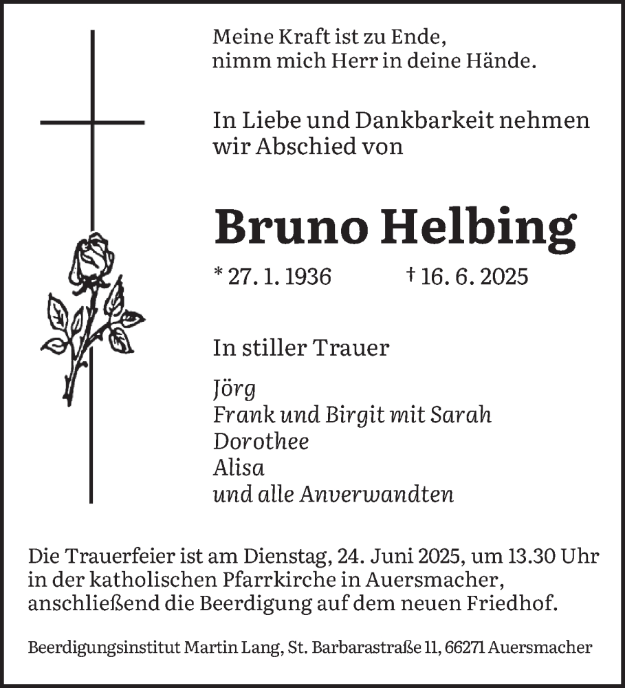 Hier finden Sie alle Traueranzeigen aus der Zeitung, die bisher für Bruno Helbing erschienen sind. Weitere Traueranzeigen, die in der Zeitung erscheinen, werden hier ebenfalls aufgelistet