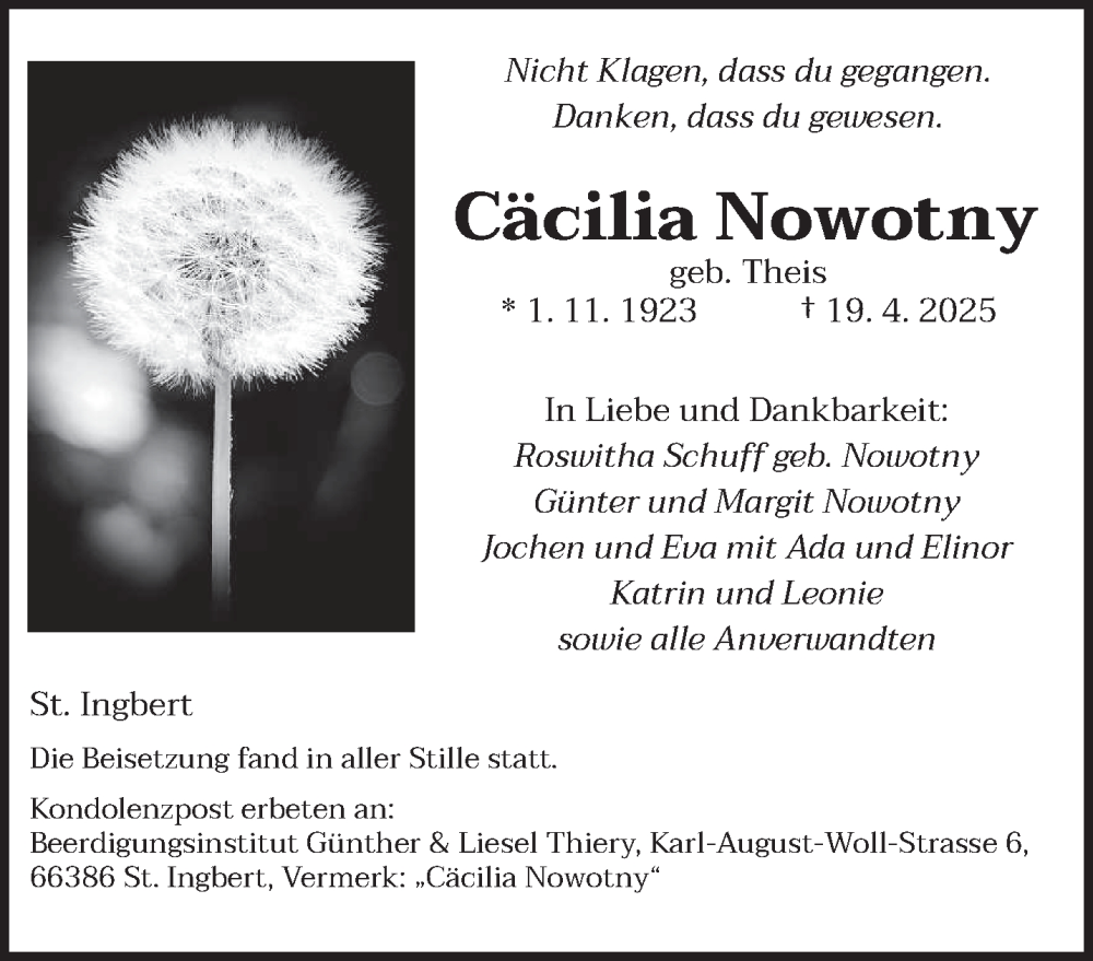 Hier finden Sie alle Traueranzeigen aus der Zeitung, die bisher für Cäcilia Nowotny erschienen sind. Weitere Traueranzeigen, die in der Zeitung erscheinen, werden hier ebenfalls aufgelistet