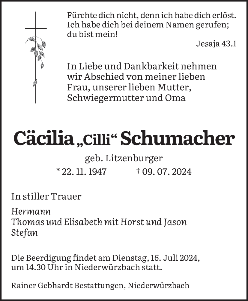 Hier finden Sie alle Traueranzeigen aus der Zeitung, die bisher für Cäcilia Schumacher erschienen sind. Weitere Traueranzeigen, die in der Zeitung erscheinen, werden hier ebenfalls aufgelistet