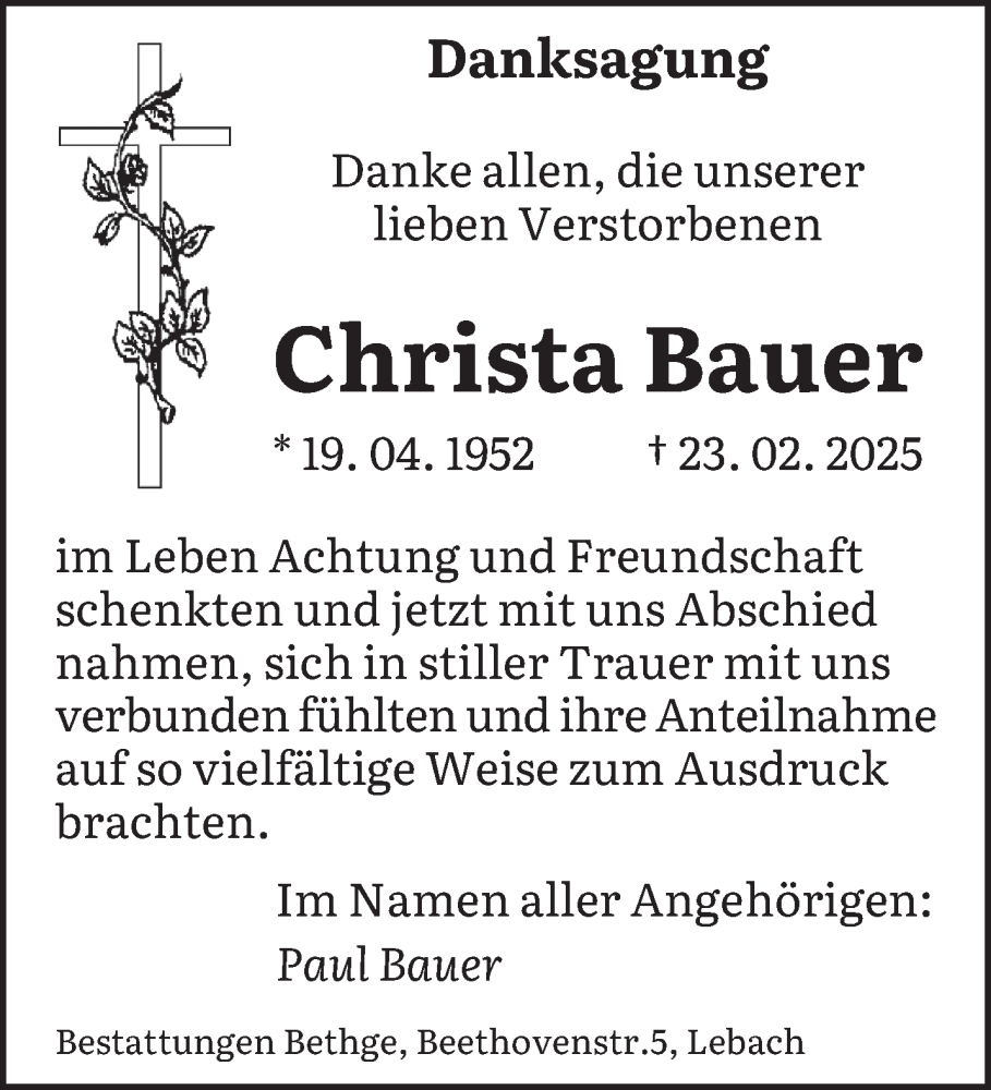 Hier finden Sie alle Traueranzeigen aus der Zeitung, die bisher für Christa Bauer erschienen sind. Weitere Traueranzeigen, die in der Zeitung erscheinen, werden hier ebenfalls aufgelistet