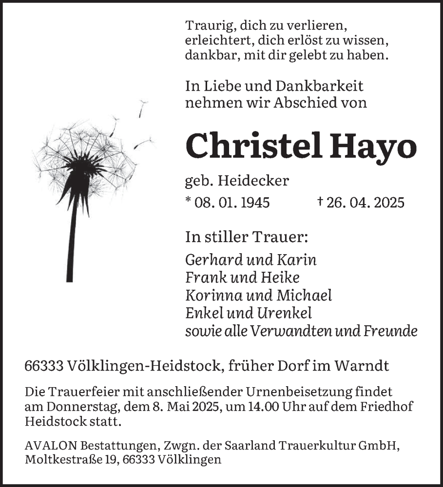 Hier finden Sie alle Traueranzeigen aus der Zeitung, die bisher für Christel Hayo erschienen sind. Weitere Traueranzeigen, die in der Zeitung erscheinen, werden hier ebenfalls aufgelistet
