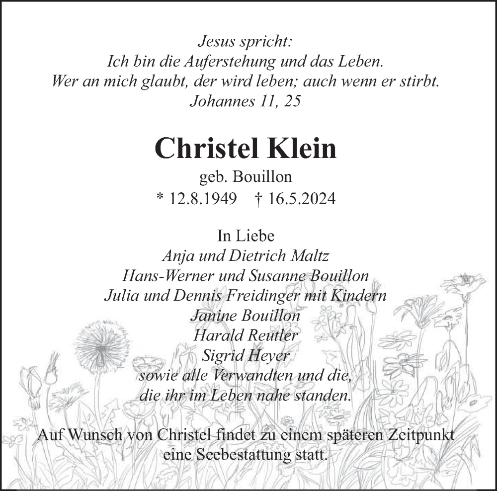 Hier finden Sie alle Traueranzeigen aus der Zeitung, die bisher für Christel Klein erschienen sind. Weitere Traueranzeigen, die in der Zeitung erscheinen, werden hier ebenfalls aufgelistet