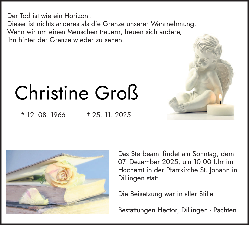 Hier finden Sie alle Traueranzeigen aus der Zeitung, die bisher für Christine Groß erschienen sind. Weitere Traueranzeigen, die in der Zeitung erscheinen, werden hier ebenfalls aufgelistet