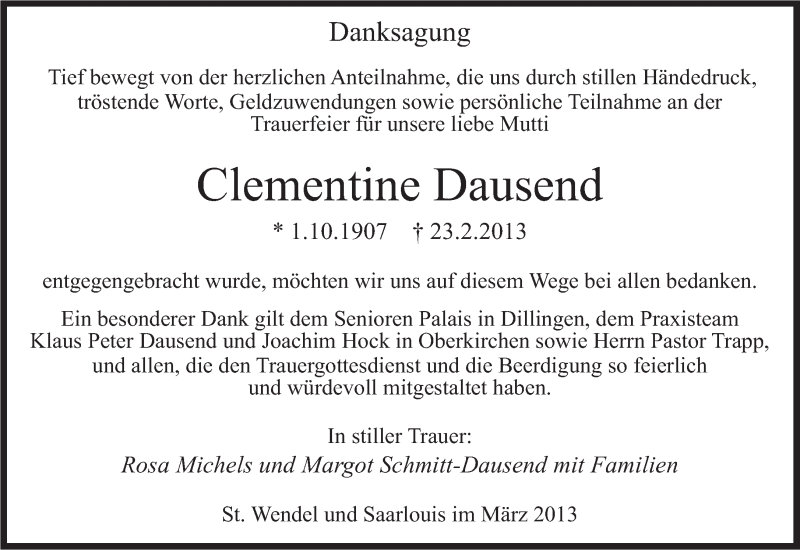 Hier finden Sie alle Traueranzeigen aus der Zeitung, die bisher für Clementine Dausend erschienen sind. Weitere Traueranzeigen, die in der Zeitung erscheinen, werden hier ebenfalls aufgelistet