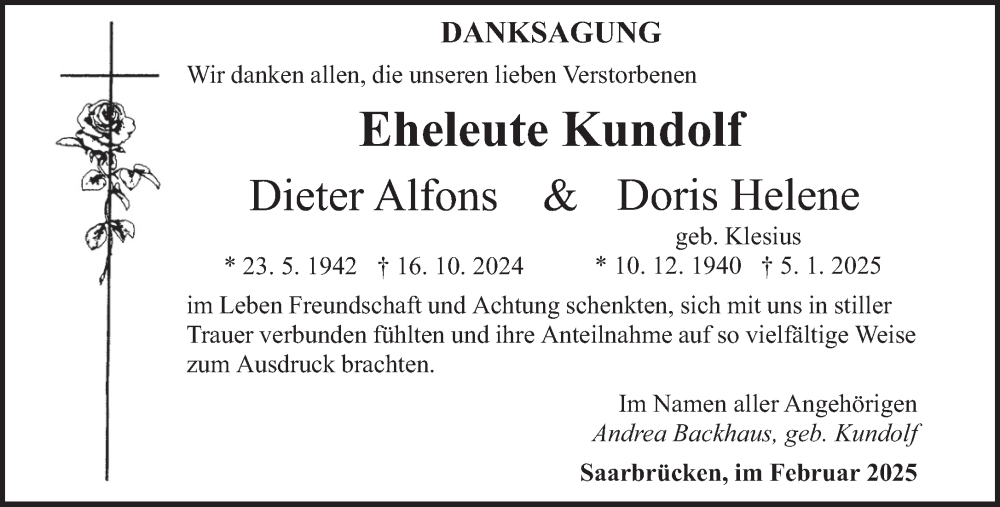 Hier finden Sie alle Traueranzeigen aus der Zeitung, die bisher für Dieter Alfons und Doris Helene Kundolf erschienen sind. Weitere Traueranzeigen, die in der Zeitung erscheinen, werden hier ebenfalls aufgelistet