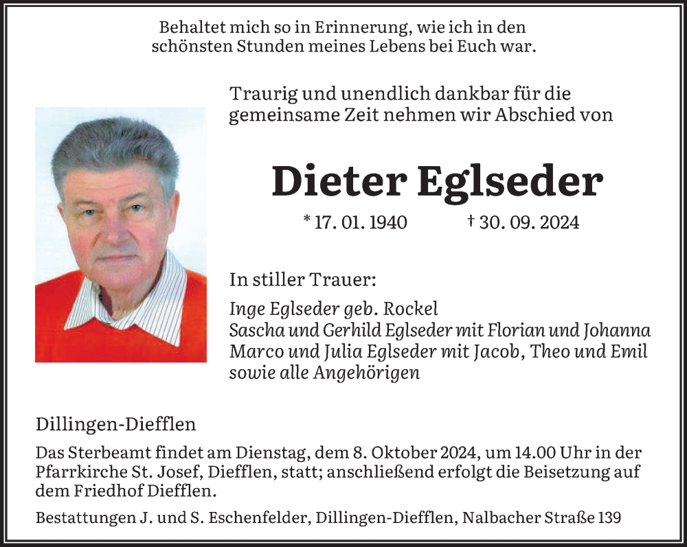 Hier finden Sie alle Traueranzeigen aus der Zeitung, die bisher für Dieter Eglseder erschienen sind. Weitere Traueranzeigen, die in der Zeitung erscheinen, werden hier ebenfalls aufgelistet