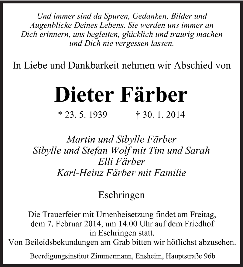 Hier finden Sie alle Traueranzeigen aus der Zeitung, die bisher für Dieter Färber erschienen sind. Weitere Traueranzeigen, die in der Zeitung erscheinen, werden hier ebenfalls aufgelistet