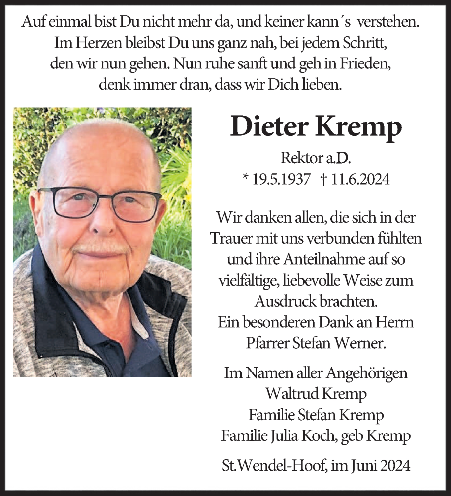 Hier finden Sie alle Traueranzeigen aus der Zeitung, die bisher für Dieter Kremp erschienen sind. Weitere Traueranzeigen, die in der Zeitung erscheinen, werden hier ebenfalls aufgelistet