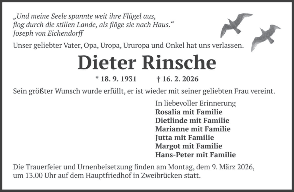 Hier finden Sie alle Traueranzeigen aus der Zeitung, die bisher für Dieter Rinsche erschienen sind. Weitere Traueranzeigen, die in der Zeitung erscheinen, werden hier ebenfalls aufgelistet