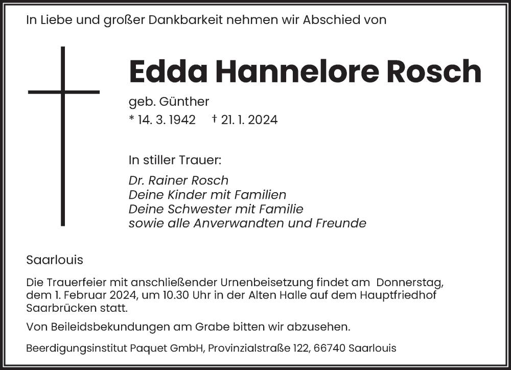 Hier finden Sie alle Traueranzeigen aus der Zeitung, die bisher für Edda Hannelore Rosch erschienen sind. Weitere Traueranzeigen, die in der Zeitung erscheinen, werden hier ebenfalls aufgelistet