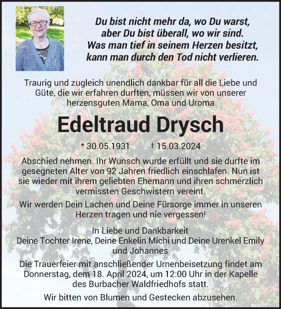 Hier finden Sie alle Traueranzeigen aus der Zeitung, die bisher für Edeltraud Drysch erschienen sind. Weitere Traueranzeigen, die in der Zeitung erscheinen, werden hier ebenfalls aufgelistet