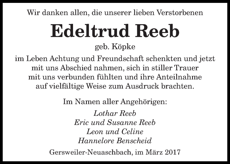 Hier finden Sie alle Traueranzeigen aus der Zeitung, die bisher für Edeltrud Reeb erschienen sind. Weitere Traueranzeigen, die in der Zeitung erscheinen, werden hier ebenfalls aufgelistet