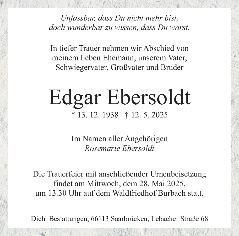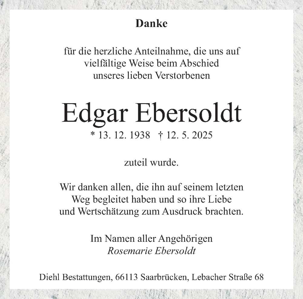 Hier finden Sie alle Traueranzeigen aus der Zeitung, die bisher für Edgar Ebersoldt erschienen sind. Weitere Traueranzeigen, die in der Zeitung erscheinen, werden hier ebenfalls aufgelistet