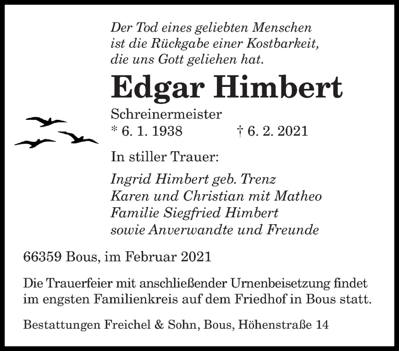 Hier finden Sie alle Traueranzeigen aus der Zeitung, die bisher für Edgar Himbert erschienen sind. Weitere Traueranzeigen, die in der Zeitung erscheinen, werden hier ebenfalls aufgelistet