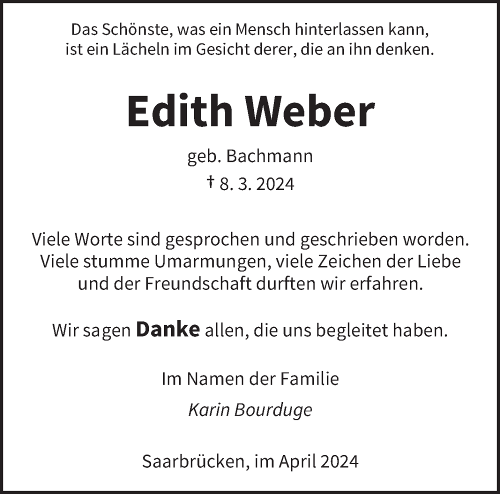 Hier finden Sie alle Traueranzeigen aus der Zeitung, die bisher für Edith Weber erschienen sind. Weitere Traueranzeigen, die in der Zeitung erscheinen, werden hier ebenfalls aufgelistet
