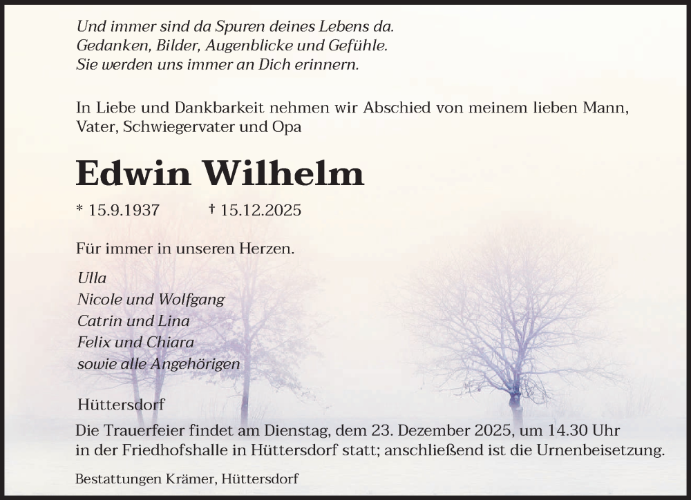 Hier finden Sie alle Traueranzeigen aus der Zeitung, die bisher für Edwin Wilhelm erschienen sind. Weitere Traueranzeigen, die in der Zeitung erscheinen, werden hier ebenfalls aufgelistet