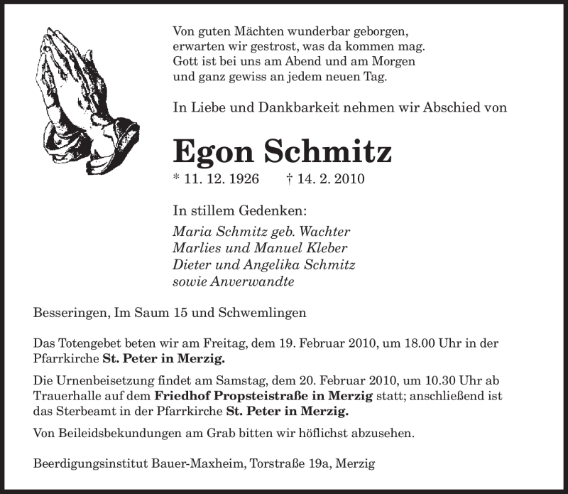 Hier finden Sie alle Traueranzeigen aus der Zeitung, die bisher für Egon Schmitz erschienen sind. Weitere Traueranzeigen, die in der Zeitung erscheinen, werden hier ebenfalls aufgelistet