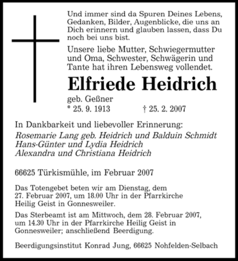 Hier finden Sie alle Traueranzeigen aus der Zeitung, die bisher für Elfriede Heidrich erschienen sind. Weitere Traueranzeigen, die in der Zeitung erscheinen, werden hier ebenfalls aufgelistet